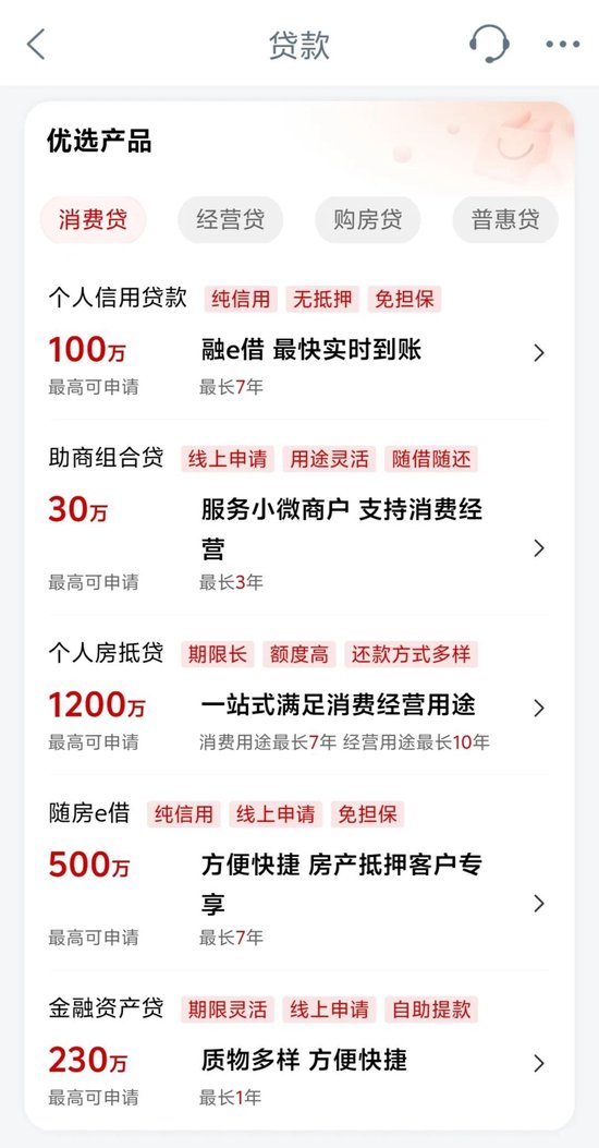 以中国银行为例,其手机银行贷款界面展示有20万元、30万元、50万元不等的消费贷产品,最高额度为20万元的“好客贷”年化利率(单利)5.4%-23.725%,最高额度30万元的“中银e贷”年利率(单利)最低为3.1%,最高额度50万元的“随心智贷”则为按日计息的浮动利率产品,贷款利率3.0%起。 在消费贷利率调整浪潮后,多家银行推出大额消费贷产品,国有大行、股份行、城商行等机构纷纷提高消费贷最高贷款金额。例如,工商银行推出最高额度100万元的个人信用贷“融e贷”和最高额度1200万元的房抵组合贷,后者可用于消费或经营;农业银行“网捷贷”最高额度100万元,年化利率(单利)3.1%起,“房抵e贷”最高额度1000万元。 建设银行“快贷”最高额度30万元,年化利率(单利)3.0%起,并提供提额服务,除可线上申请的“快贷”外,建设银行还推出主要通过线下渠道申请的“建易贷”,最高额度100万元,年化利率为3.3%起。 交通银行“惠民贷”最高额度为100万元;邮储银行“邮享贷”最高额度100万元,房屋抵押消费贷款最高额度500万元。