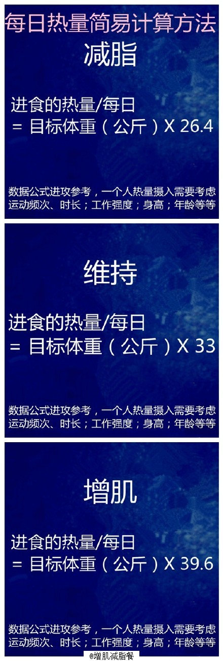 【健身饮食常识】 1、1克蛋白质=4kcl,1克碳水=4kcl,1克脂肪=9kcl; 2、蛋白质的食物热效应高出脂肪好几倍,大概达到自身热量20%~30%,脂肪仅为3%~5%; 3、三餐热量分配25%~30%,40%~45%,30%(仅供参考); 4、减脂期每日建议碳水,蛋白质,脂肪比例,4:4:2; 5、人体每天所需热量计算